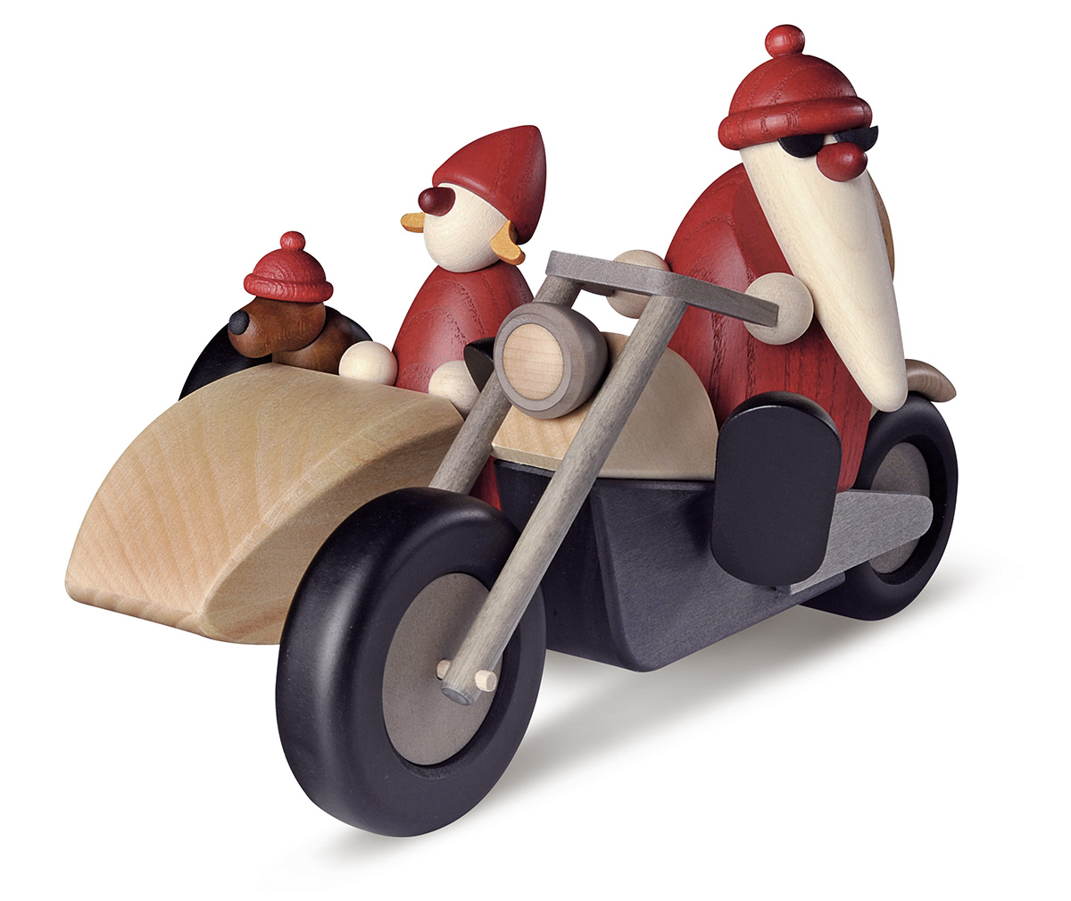 Köhler Weihnachtsmann mit Weihnachtsfrau und Kind auf Motorrad auf dem Weg zum Familienausflug
