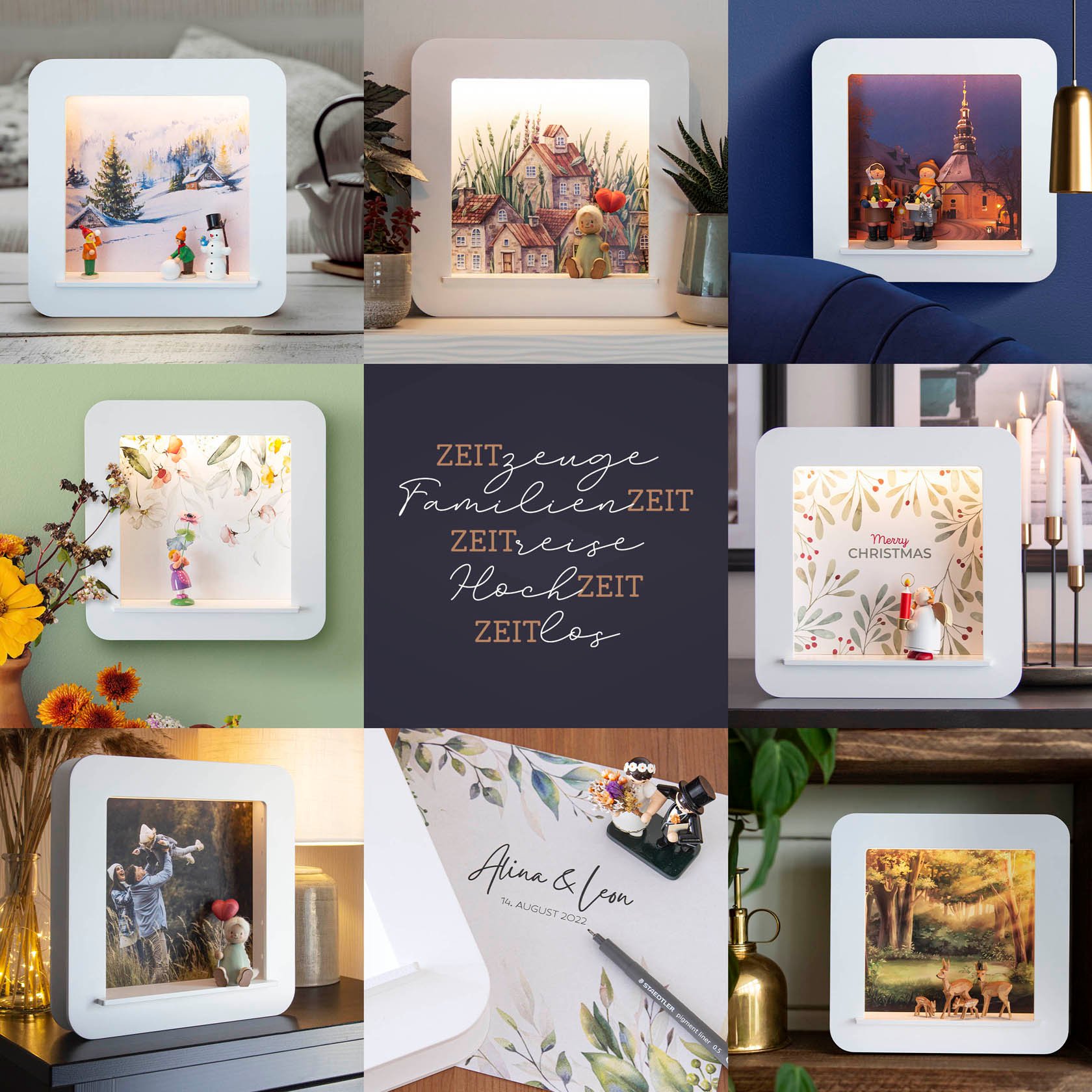 Objektrahmen in weiß mit LED-Beleuchtung und 10 austauschbaren Hintergründen, batteriebetrieben -Zeitfenster-