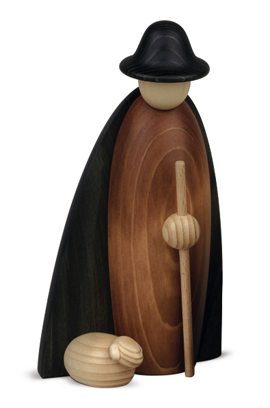 Die Nacht bricht ein und an Ihrer modernen Krippe bereitet der Köhler-Schäfer seine Herde auf eine sichere Nacht vor: Ein kleines Schäfchen lässt er sogar liebevoll behütet in seinem Mantel schlafen. Durch die fichtenfarbige Lasur seines Oberkörper integriert er sich dieser Köhler-Hirte perfekt in Ihre moderne Figuren-Sammlung.