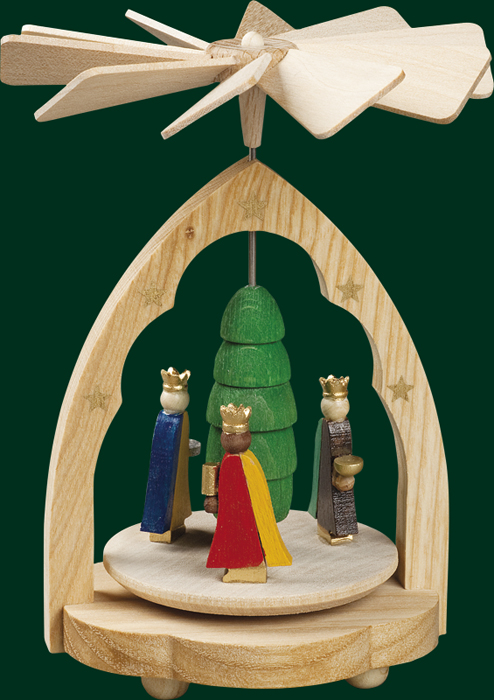 Eine wahre Augenfreude der Volkskunst aus Seiffen! Die lebensfrohen Farbnuancen und die sorgfältige Handarbeit ermöglichen Ihnen in die festliche Weihnachtsatmosphäre einzutauchen. Authentisch gestaltet der bekannte Hersteller Richard Glässer seine Heiligen Drei Könige, dessen goldenen Kronen wunderschön glänzen. Durch aufsteigende Wärmeluft können die eleganten Holzfiguren in die Bewegung versetzt werden, wodurch das Ganze noch zauberhafter wirkt.