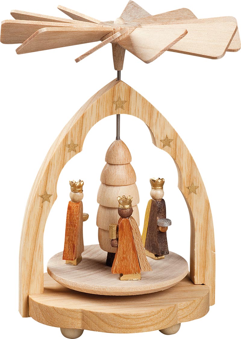 Weniger Farben, doch nicht weniger besonders! Ganz weihnachtlich wirkt die vom bekannten Hersteller Richard Glässer entworfene natürliche Szene. Durch den Aufstieg der Wärmeluft können die glaubwürdig aussehenden Heiligen Drei Könige der Erzgebirgischen Volkskunst sanft in Bewegung gebracht werden. So strahlt der mittig platzierte Weihnachtsbaum zusammen mit dem Glanz der goldenen Kronen die festlichen Gefühle aus!
